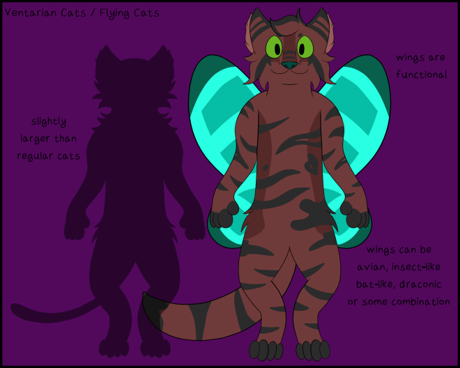 Flying cats are more or less what it says on the tin; cats with wings. They tend to be a little bigger than a normal cat. What wings they can have include bird, bat, dragon, or insect wings. These wings are functional, most certainly using magic to actually fly.