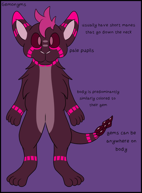 The gemonyms hail from the underground network of caves of [[Brink]]. They are small rabbit-like creatures whose most striking feature is the gems set in their bodies. They possess large eyes (to help them navigate in the dark), a short mane down their neck and strong back legs.
