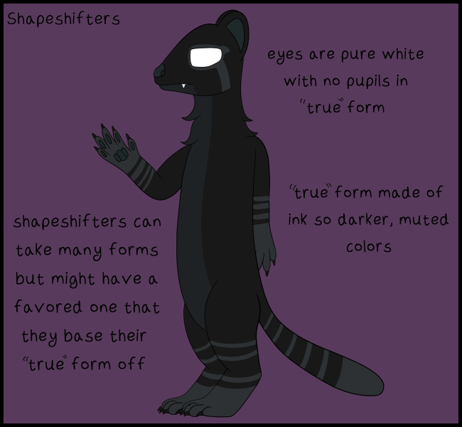 Shapeshifters are amorphous creatures made of ink which, hence the name, can shapeshift. They are the corrupted creations of Inketch who, when their creator was exiled, took on this form. Only the ones with the strongest wills were able to hold onto their shapes while others simply melted into ink and perished. All shapeshifters are aligned under Ink because of this which gives them their shapeshifting abilities.